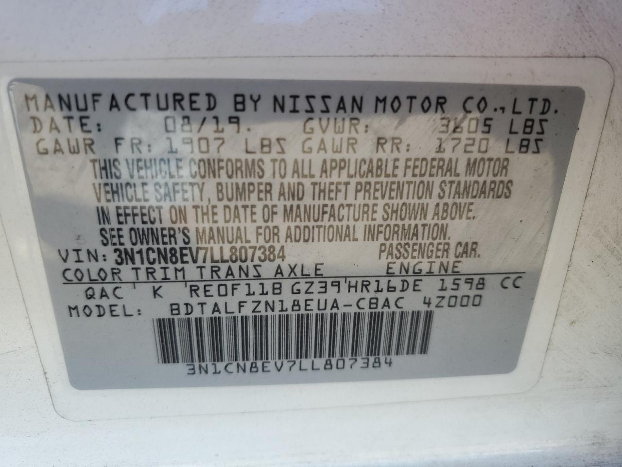 Колір БілийЦиліндри 4VIN 3N1CN8EV7LL807384Стан Заводиться та їде (перевірено)Ушкодження Передня або задня