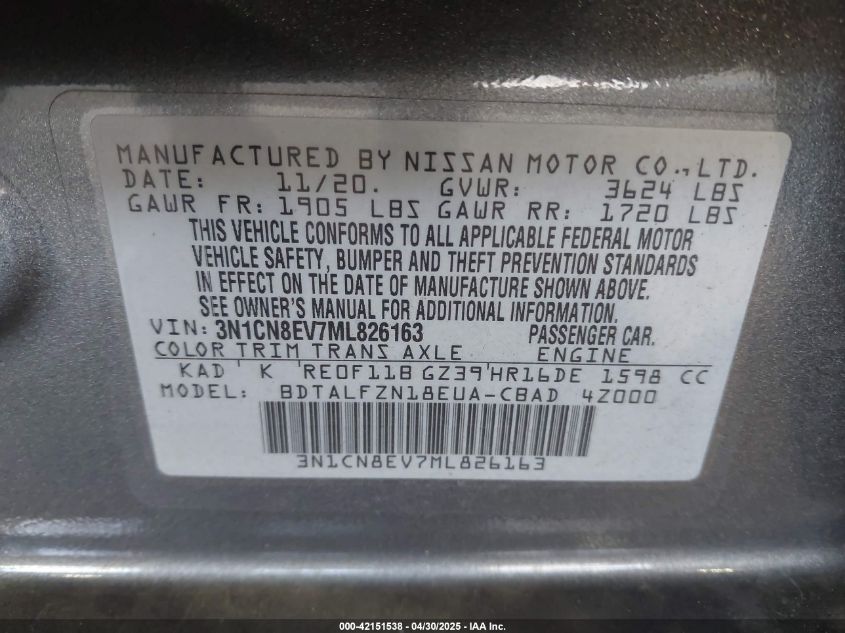 Колір СірийЦиліндри 4Привід Передній привідVIN 3N1CN8EV7ML826163Стан СтаціонарноУшкодження Передня або задня
