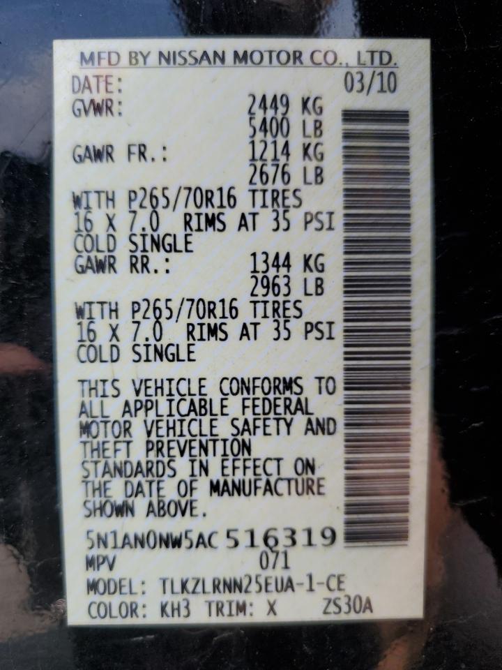 2010 NISSAN XTERRA - 5N1AN0NW5AC516319, колір - Чорний, 4.0, Бензин, 4x4 з заднім приводом із США