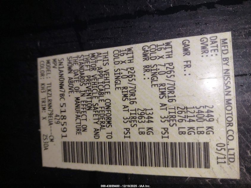 Колір ЧорнийЦиліндри 6Привід Повний привідVIN 5N1AN0NW7BC518591Стан Заводиться та їде (перевірено)Ушкодження Передня або задня