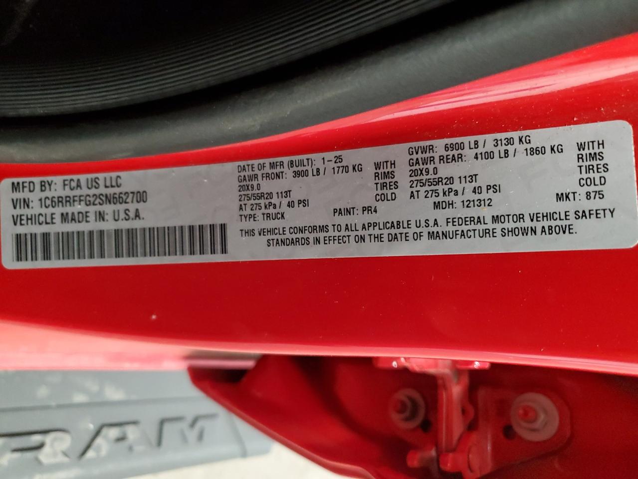 Колір ЧервонийЦиліндри 6Привід 4x4 з заднім приводомVIN 1C6RRFFG2SN662700Стан Заводиться та їде (перевірено)Ушкодження Передня або задняДата аукціона 2025-10-07