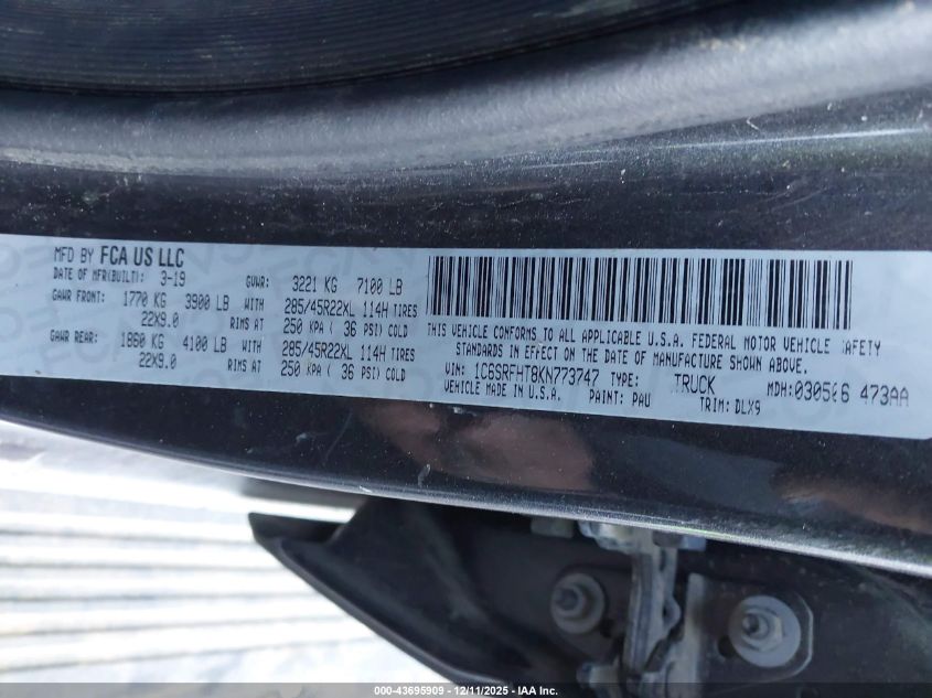 Колір СірийЦиліндри 8Привід Повний привідVIN 1C6SRFHT8KN773747Стан СтаціонарноУшкодження Задня