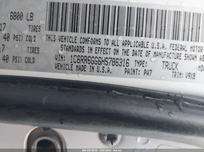 Колір БілийЦиліндри 6VIN 1C6RR6GG6HS786316Стан Заводиться та їде (перевірено)Ушкодження Звичайний зносДата аукціона 2025-12-17