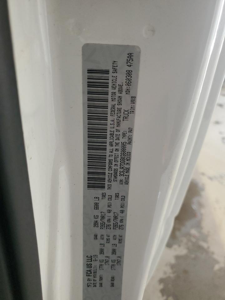 Колір БілийЦиліндри 6Привід 4x4 з заднім приводомVIN 3C6JR7DG6KG600005Стан Заводиться та їде (перевірено)Ушкодження НезначніДата аукціона 2025-10-09