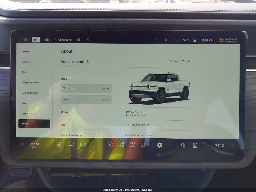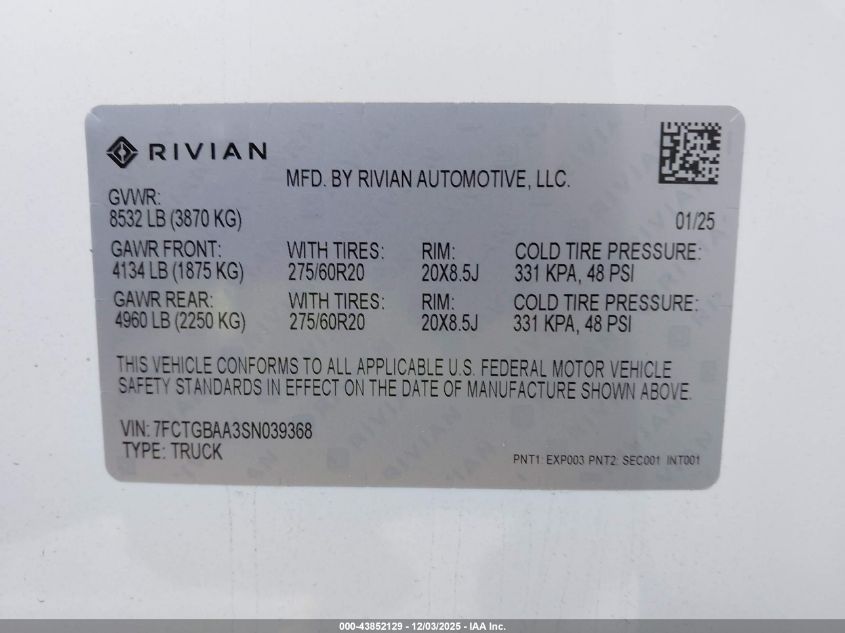 2025 RIVIAN R1T - 7FCTGBAA3SN039368, колір - Білий, 0.0, Електричний, Повний привід із США