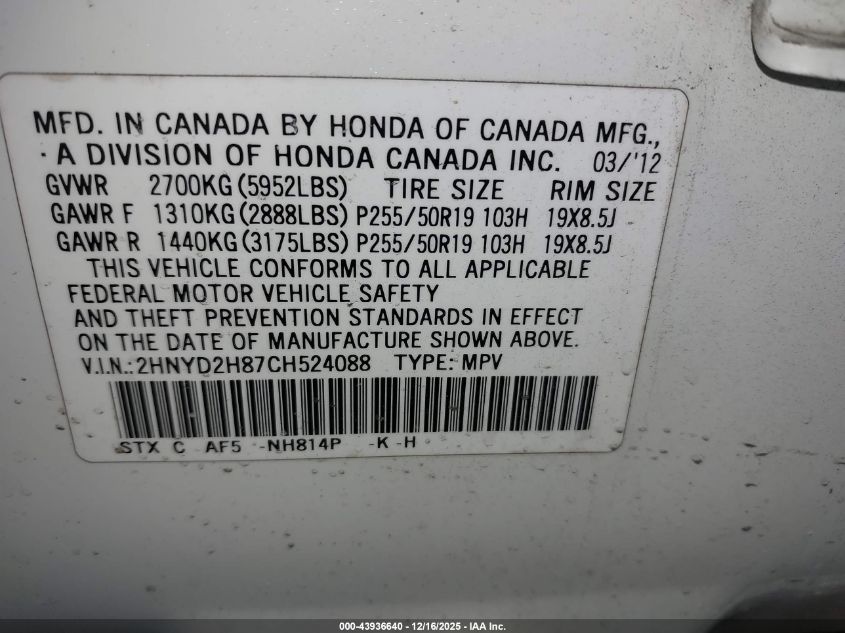 2012 ACURA MDX - 2HNYD2H87CH524088, цвет - , 3.7, Бензин, Полный привод из США