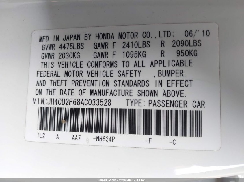 2010 ACURA TSX - JH4CU2F68AC033528, цвет - , 2.4, Бензин, Передний привод из США
