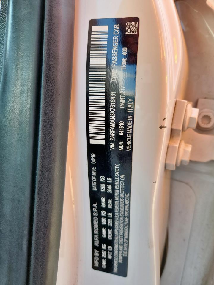 2019 ALFA ROMEO GIULIA - ZARFAMAN3K7616431, цвет - Белый, 2.0, Бензин, Задний привод из США