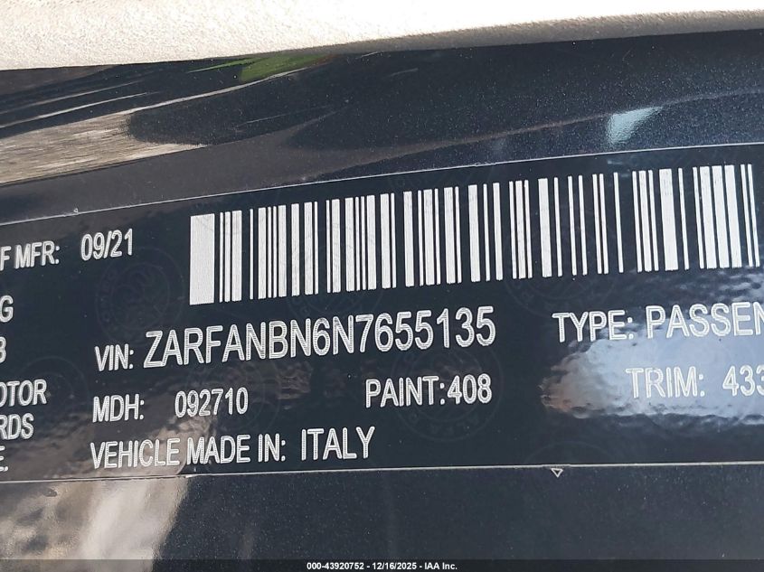 2022 ALFA ROMEO GIULIA - ZARFANBN6N7655135, цвет - , 2.0, Бензин, Полный привод из США