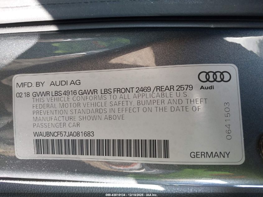 Цвет СерыйЦилиндры 4Привод Полный приводVIN WAUBNCF57JA081683Состояние СтационарноПовреждения Передняя или задняя