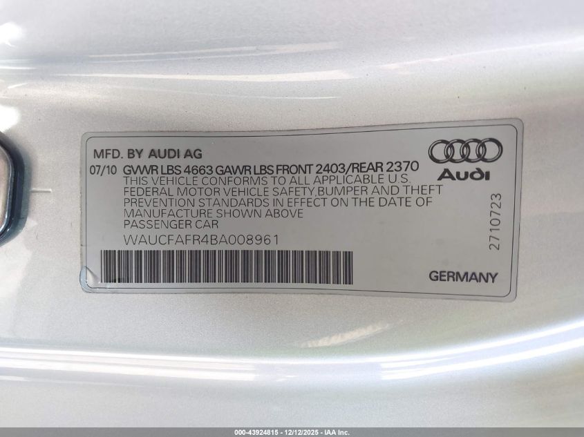 2011 AUDI A5 - WAUCFAFR4BA008961, цвет - Серебряный, 2.0, Бензин, Полный привод из США