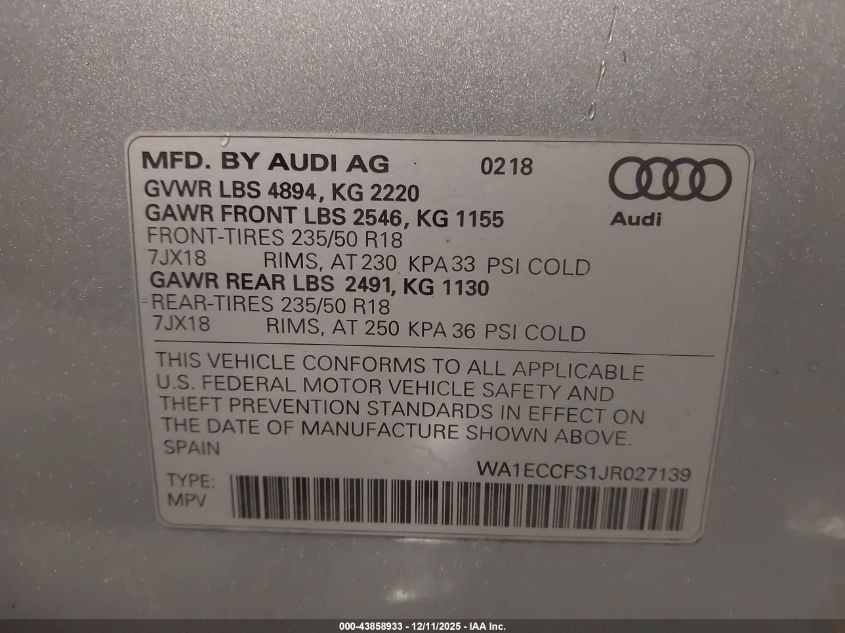 2018 AUDI Q3 - WA1ECCFS1JR027139, цвет - Серебряный, 2.0, Бензин, Полный привод из США