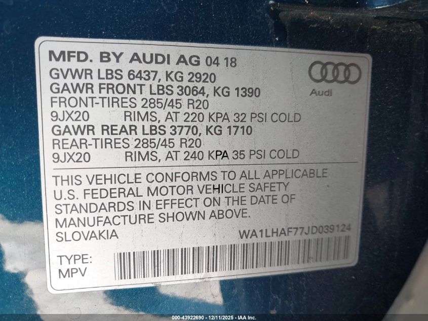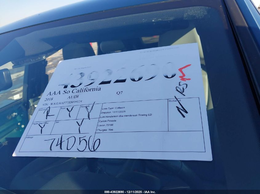 2018 AUDI Q7 - WA1LHAF77JD039124, цвет - Синий, 2.0, Бензин, Полный привод из США