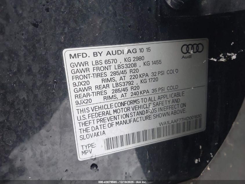 Цвет ЧерныйЦилиндры 6Привод Полный приводVIN WA1LAAF77HD001830Состояние СтационарноПовреждения Механические поврежденияДата аукциона 2025-12-18