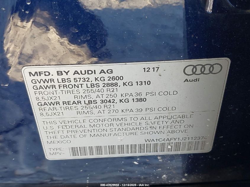 2018 AUDI SQ5 - WA1C4AFY1J2112374, цвет - Синий, 3.0, Бензин, Полный привод из США