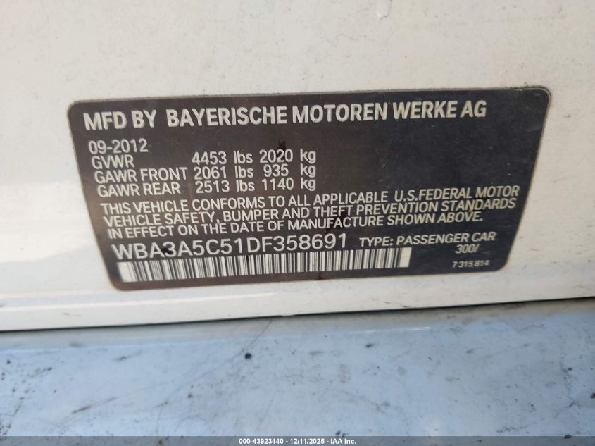 2013 BMW 3 SERIES - WBA3A5C51DF358691, цвет - Синий, 2.0, Бензин, Задний привод из США