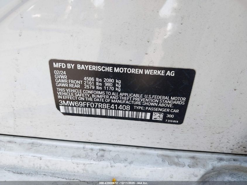2024 BMW 3 SERIES - 3MW69FF07R8E41408, цвет - Белый, 2.0, Бензин, Задний привод из США