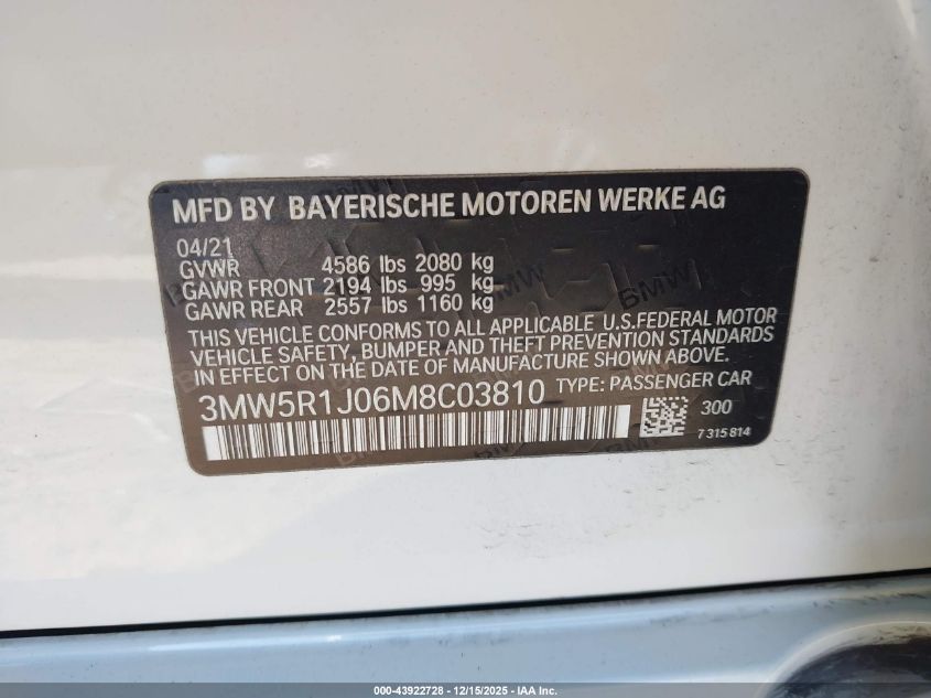 2021 BMW 3 SERIES - 3MW5R1J06M8C03810, цвет - Белый, 2.0, Бензин, Задний привод из США