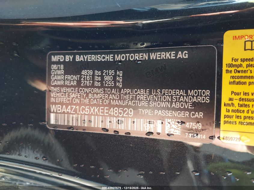 2019 BMW 4 SERIES - WBA4Z1C5XKEE48529, цвет - Черный, 2.0, Бензин, Задний привод из США