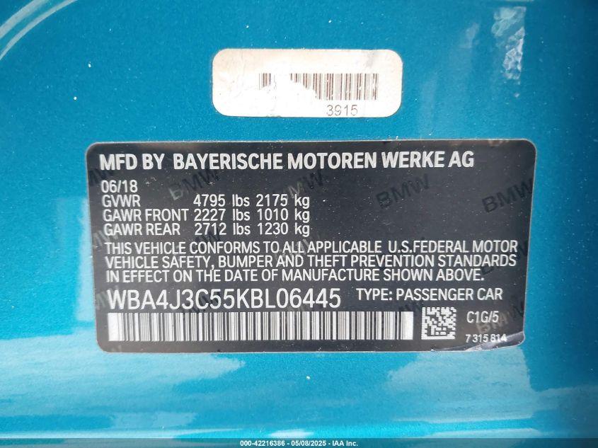 2019 BMW 4 SERIES - WBA4J3C55KBL06445, цвет - Синий, 2.0, Бензин, Полный привод из США