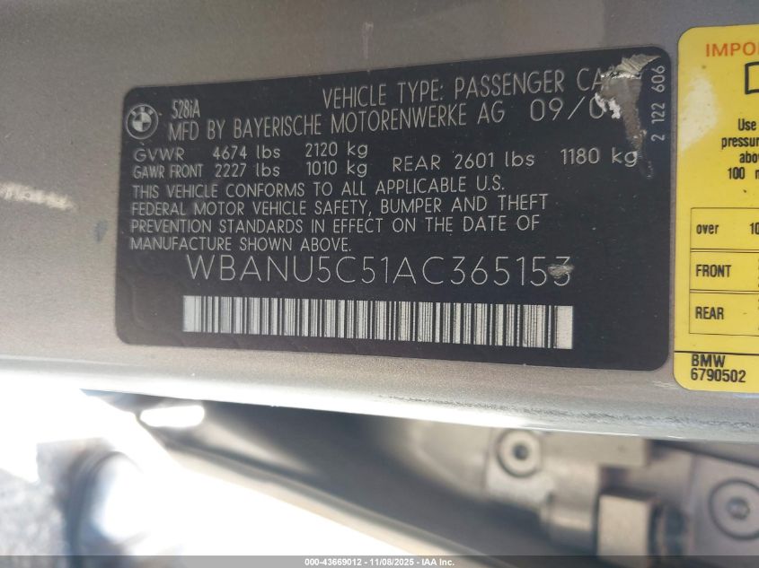 2010 BMW 5 SERIES - WBANU5C51AC365153, цвет - , 3.0, Бензин, Задний привод из США