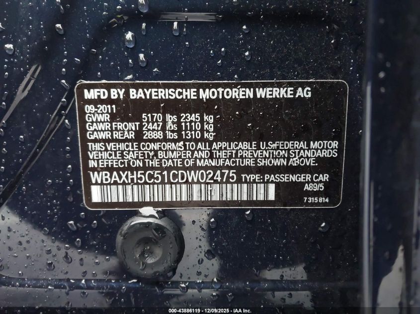 2012 BMW 5 SERIES - WBAXH5C51CDW02475, цвет - Синий, 2.0, Бензин, Полный привод из США