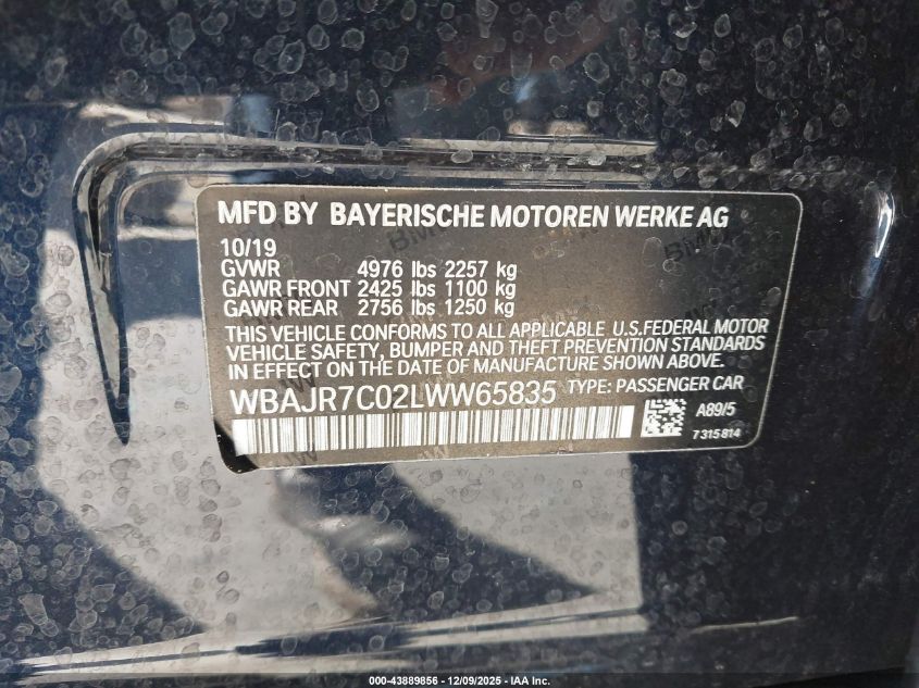 2020 BMW 5 SERIES - WBAJR7C02LWW65835, цвет - Синий, 2.0, Бензин, Полный привод из США