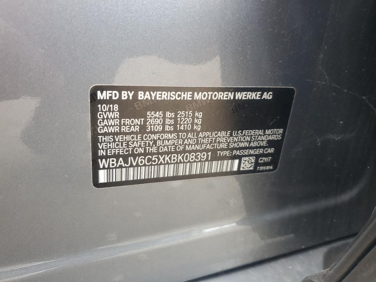 Цвет СерыйЦилиндры 6Привод Полный приводVIN WBAJV6C5XKBK08391Состояние НеизвестноПовреждения Передняя или задняя