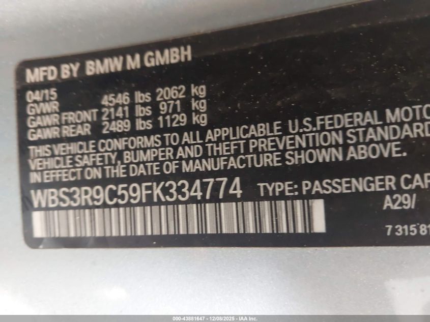 2015 BMW M4 - WBS3R9C59FK334774, цвет - Серебряный, 3.0, Бензин, Задний привод из США