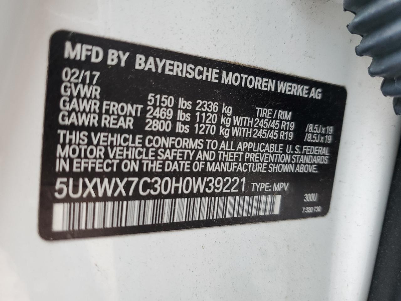 2017 BMW X3 - 5UXWX7C30H0W39221, цвет - Белый, 3.0, Бензин, Полный привод из США