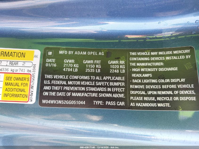 2016 BUICK CASCADA - W04WV3N52GG051044, цвет - , 1.6, Бензин, Передний привод из США