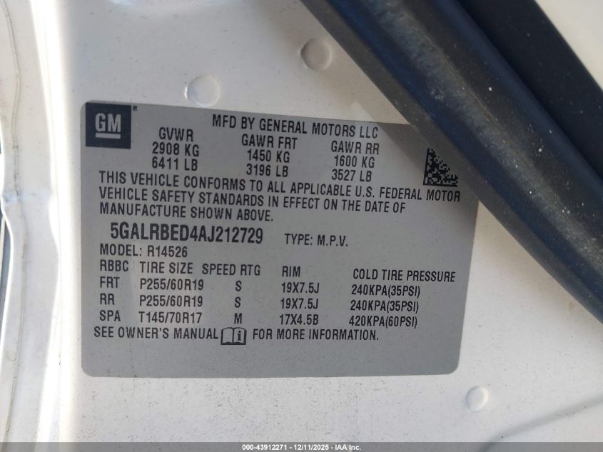 Цвет БелыйЦилиндры 6Привод Передний приводVIN 5GALRBED4AJ212729Состояние СтационарноПовреждения Обычный износ