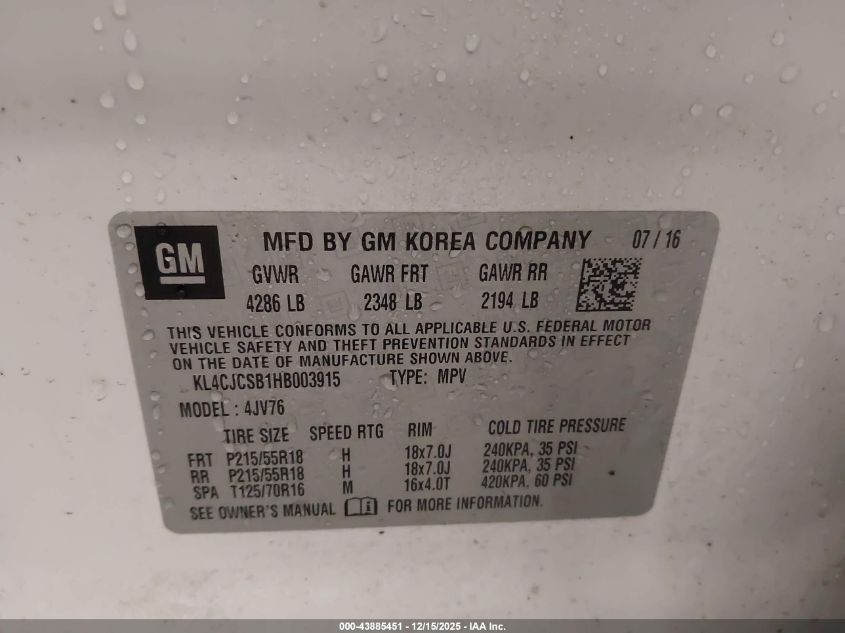 2017 BUICK ENCORE - KL4CJCSB1HB003915, цвет - Белый, 1.4, Бензин, Передний привод из США