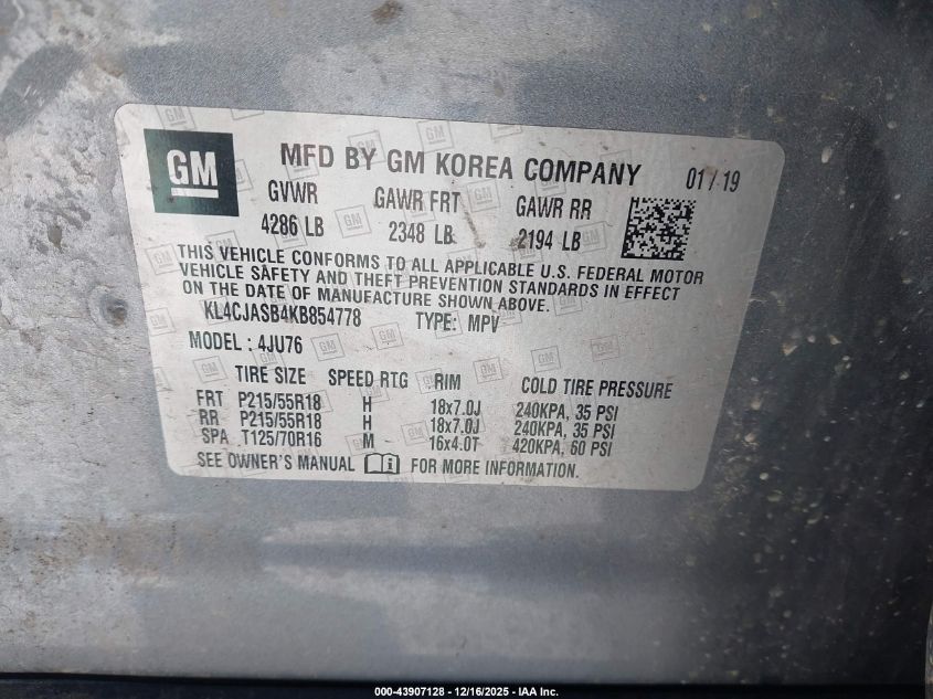 2019 BUICK ENCORE - KL4CJASB4KB854778, цвет - Серый, 1.4, Бензин, Передний привод из США