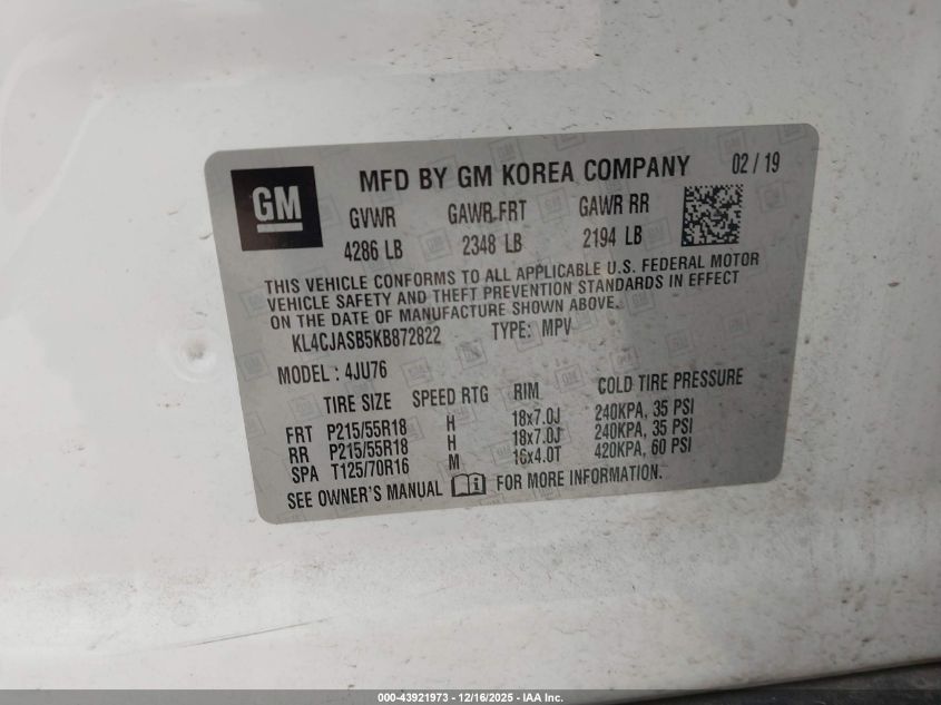 2019 BUICK ENCORE - KL4CJASB5KB872822, цвет - Белый, 1.4, Бензин, Передний привод из США