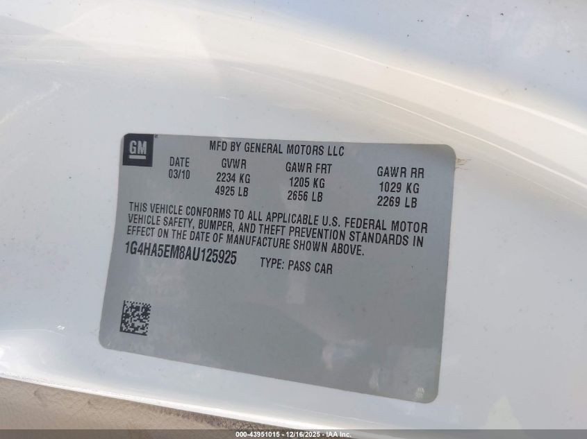 2010 BUICK LUCERNE - 1G4HA5EM8AU125925, цвет - Белый, 3.9, Бензин, Передний привод из США
