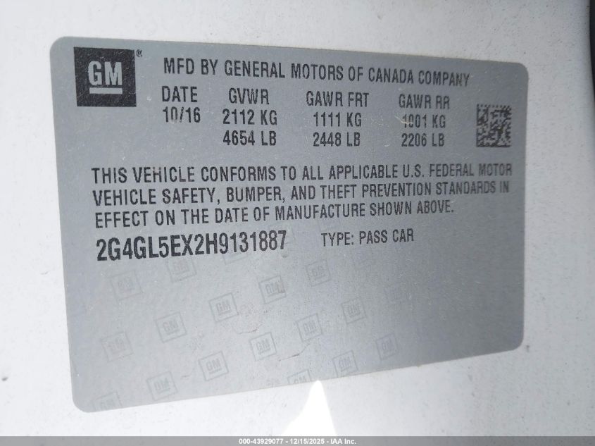 2017 BUICK REGAL - 2G4GL5EX2H9131887, цвет - Белый, 2.0, Бензин, Передний привод из США