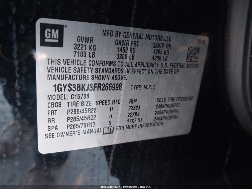 Цвет ЧерныйЦилиндры 8VIN 1GYS3BKJ3FR266998Состояние СтационарноПовреждения Вандализм