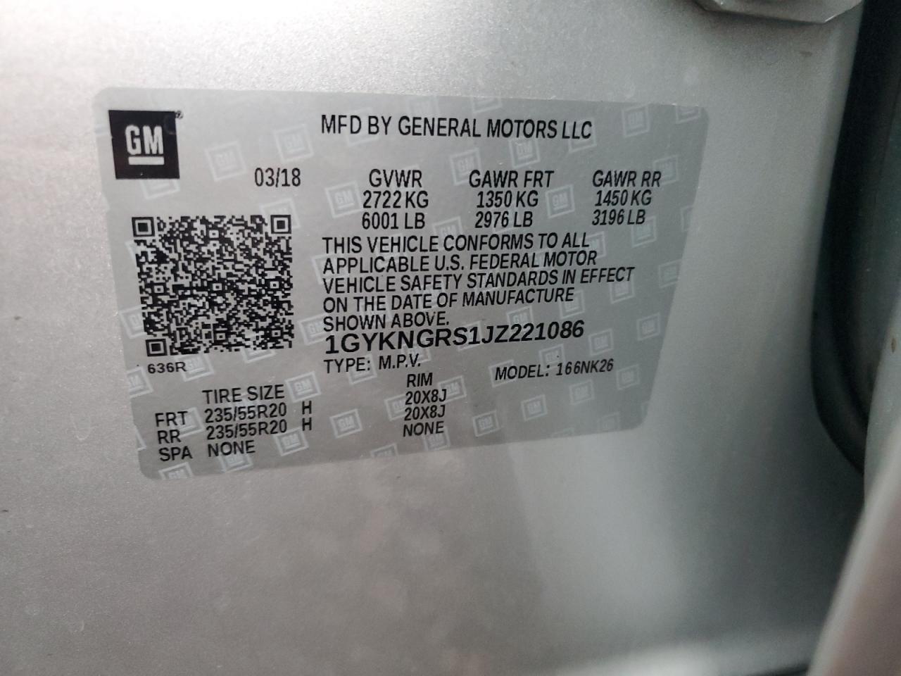Цвет СеребряныйЦилиндры 6Привод Полный приводVIN 1GYKNGRS1JZ221086Состояние Заводится и едет (проверено)Повреждения ЗадняяДата аукциона 2025-10-07