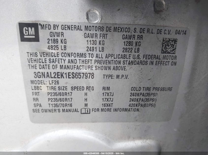 2014 CHEVROLET CAPTIVA - 3GNAL2EK1ES657978, цвет - Серебряный, 2.4, Бензин, Передний привод из США