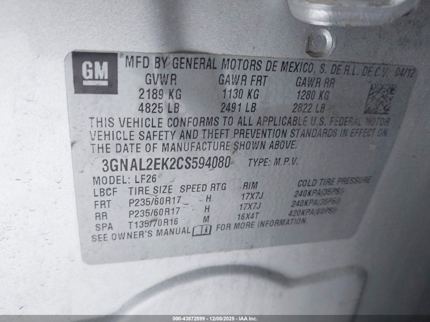 2012 CHEVROLET CAPTIVA - 3GNAL2EK2CS594080, цвет - Серебряный, 2.4, Бензин, Передний привод из США