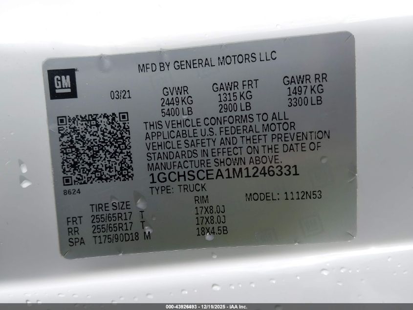 2021 CHEVROLET COLORADO - 1GCHSCEA1M1246331, цвет - Белый, 2.5, Бензин, из США