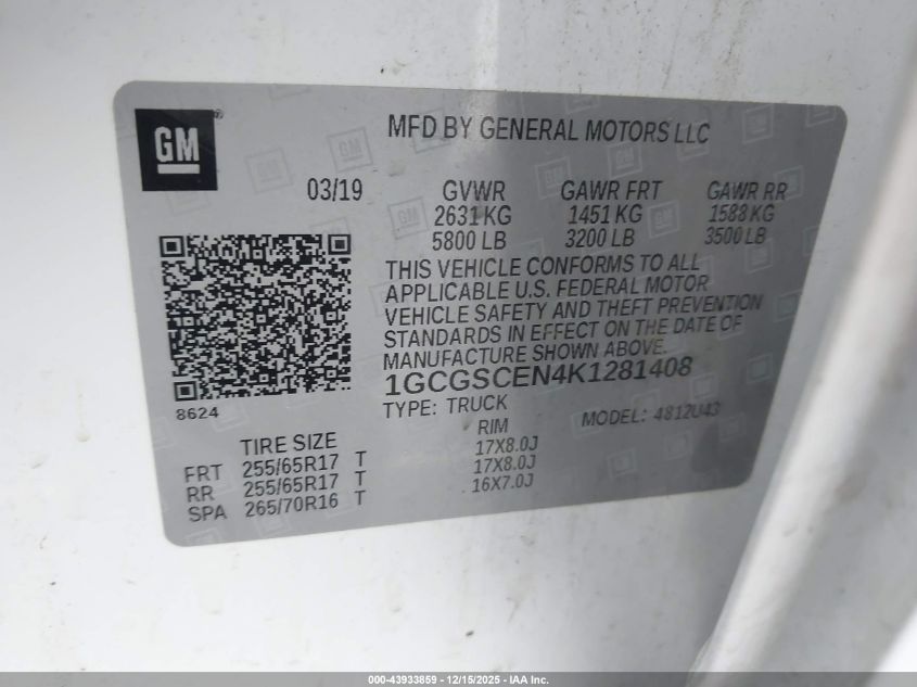 2019 CHEVROLET COLORADO - 1GCGSCEN4K1281408, цвет - Белый, 3.6, Бензин, из США