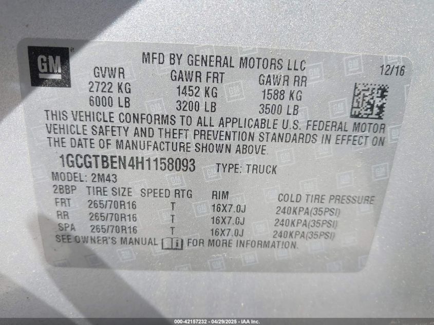 2017 CHEVROLET COLORADO - 1GCGTBEN4H1158093, цвет - Серебряный, 3.6, Бензин, Полный привод из США