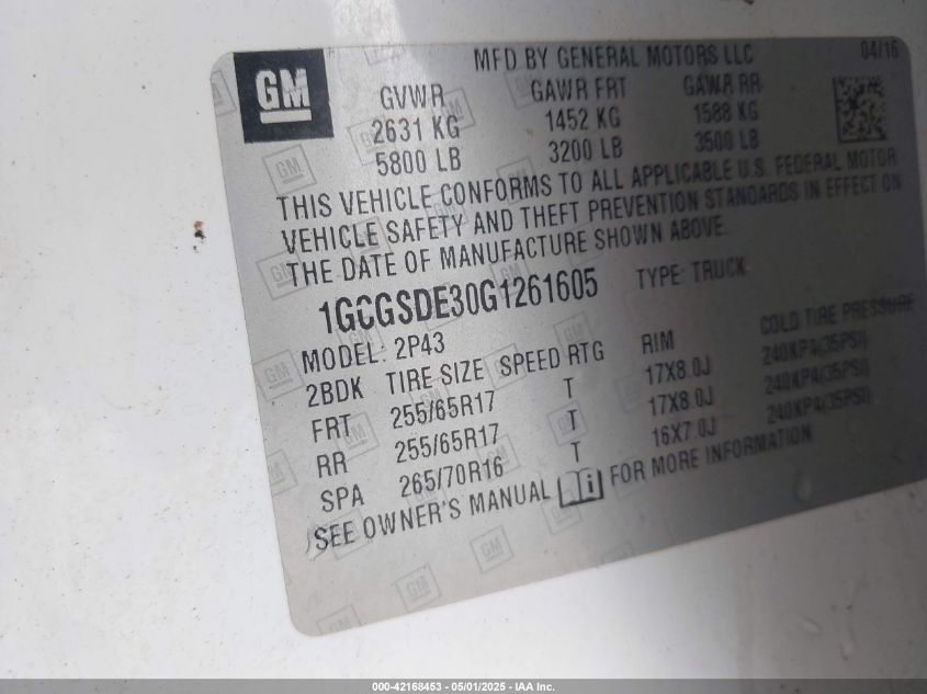 2016 CHEVROLET COLORADO - 1GCGSDE30G1261605, цвет - Белый, 3.6, Бензин, Неизвестно из США