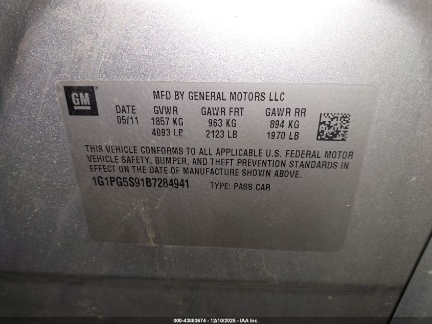 2011 CHEVROLET CRUZE - 1G1PG5S91B7284941, цвет - Серебряный, 1.4, Бензин, Передний привод из США