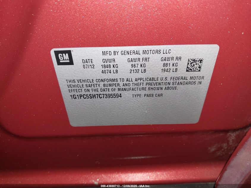 2012 CHEVROLET CRUZE - 1G1PC5SH7C7395594, цвет - Апельсиновый, 1.8, Бензин, Передний привод из США