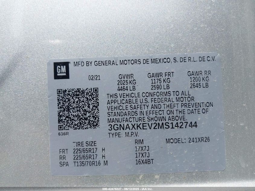 2021 CHEVROLET EQUINOX - 3GNAXKEV2MS142744, цвет - Серебряный, 1.5, Бензин, Передний привод из США