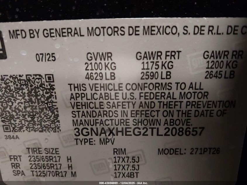 Цвет ЧерныйЦилиндры 4Привод Передний приводVIN 3GNAXHEG2TL208657Состояние СтационарноПовреждения Передняя праваяДата аукциона 2025-12-17