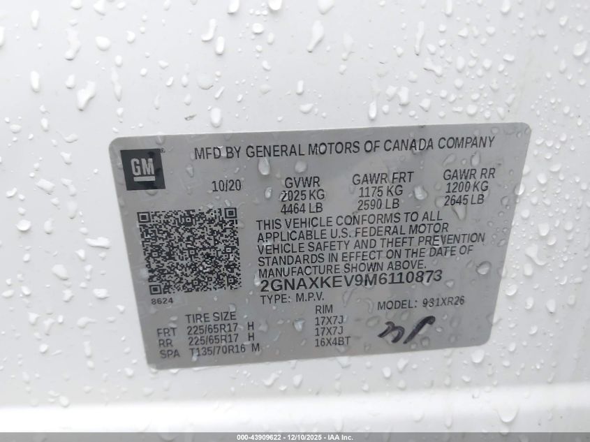 2021 CHEVROLET EQUINOX - 2GNAXKEV9M6110873, цвет - Белый, 1.5, Бензин, Передний привод из США